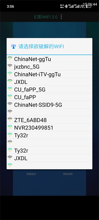3、点击「开始破解」后,会扫描周边可连接的 WiFi 列表,选择你想要破解的目标 WiFi。