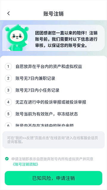 4、勾选“申请注销即代表自愿放弃账号内所有虚拟资产并同意《账号注销须知》”,点击“已知风险,申请注销”