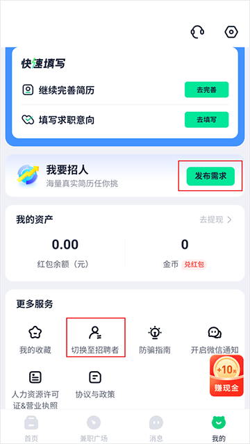 2、接着点击“发布需求”,或者在“更多服务”中找到“切换至招聘者”