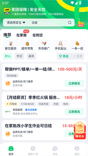 青团社兼职是专注大学生群体的智能兼职服务平台,汇聚星巴克、麦当劳等5000+名企入驻,提供150万+优质岗位,独创11重岗位审核与薪资保障体系,联合平安银行提供兼职意外险,全程管家式服务解决兼职纠纷,覆盖餐饮、教育、零售等20大类280种岗位,支持日结、月结多种结算方式,让学生边玩边赚积累经验。