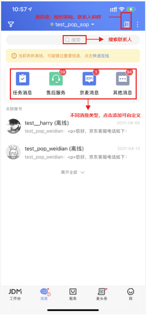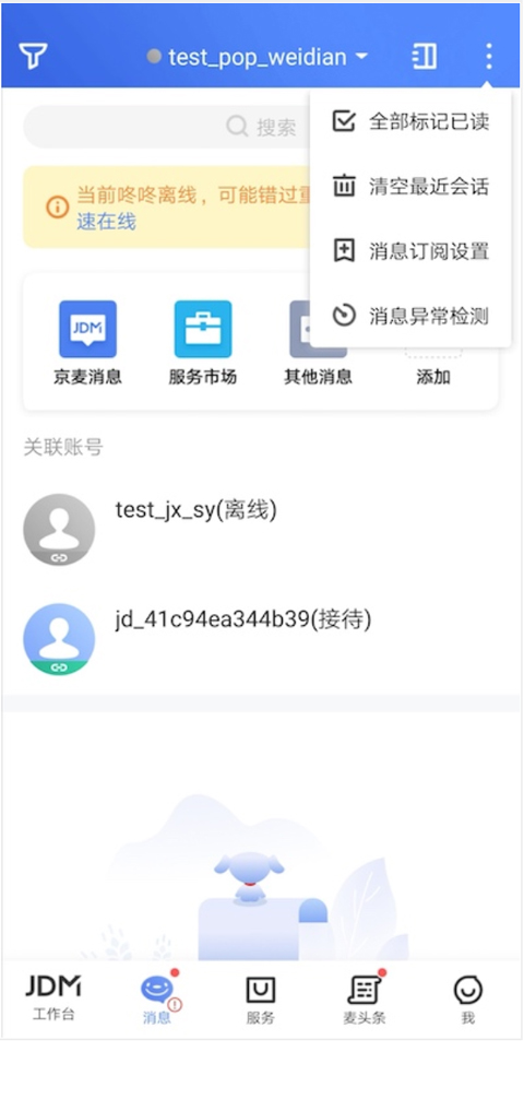 咚咚消息是商家与客户进行高效沟通的平台,点击京麦app中的“咚咚"进入该功能界面