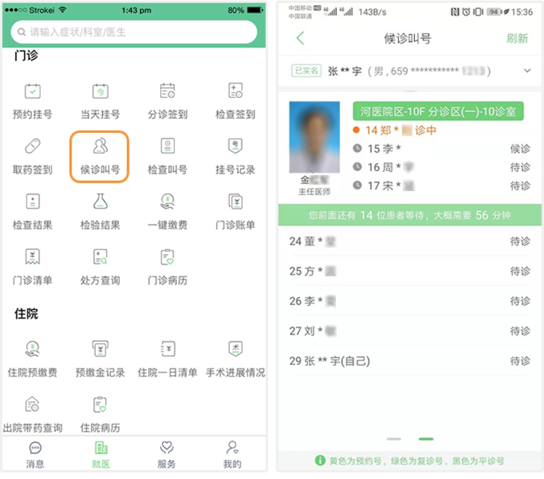 在“排队叫号”模块下可实时查询侯诊排队信息、检查排队信息,患者在非等候区可查看到排队情况,仅限当天就诊。