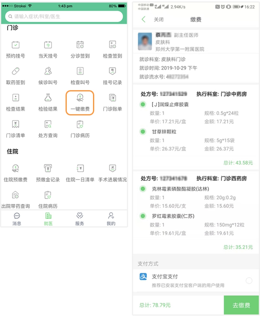 点击缴费界面的就诊记录进行待缴费界面,核对无误后点击下方的支付按钮完成在线一键支付,生成缴费订单。缴费成功后按内容提示到取药药房前的报到机上进行扫码取药报到。