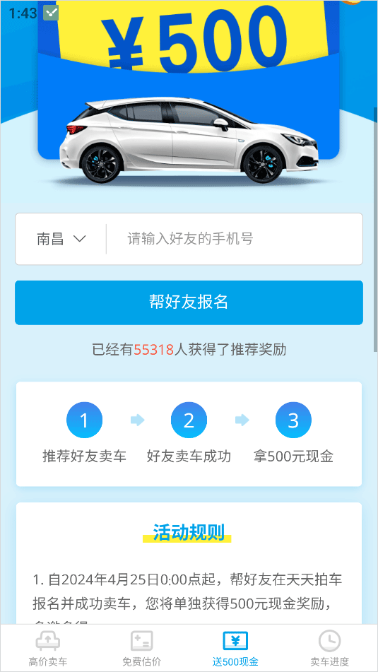 3、还可以输入好友的手机号帮好友报名,好友卖车成功后你还可以获得一笔推荐奖励;