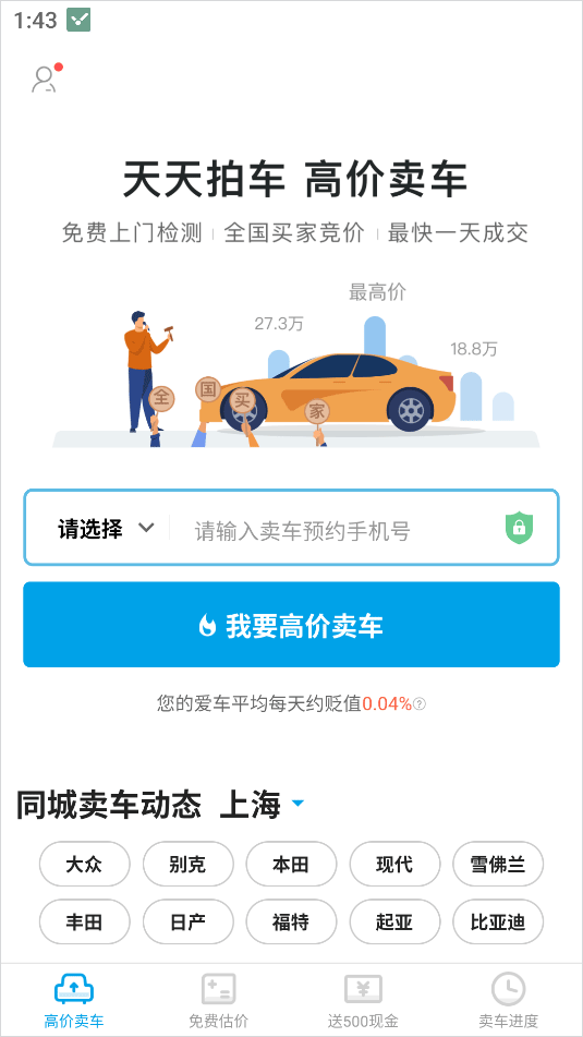 1、打开天天拍车App,进入到高价卖车页面,输入电话号码即可进行预约拍卖自己的车辆,还能查看很多同城的卖车动态;