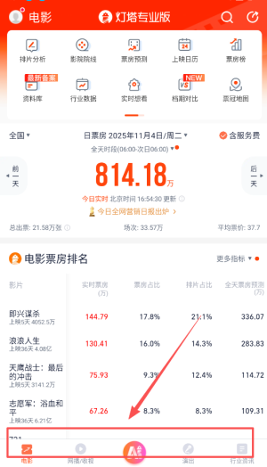 A:打开APP首页点击“票房”板块,即可查看今日实时大盘,点击具体影片可查看详细分账数据。