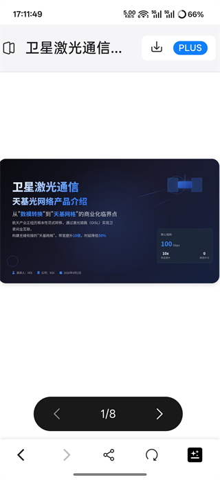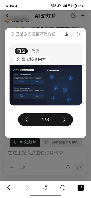 5、比如我发送了一段卫星激光通信产品的资料,等待一段时间后Genspark AI会生成一份PPT可以点击进入查看。