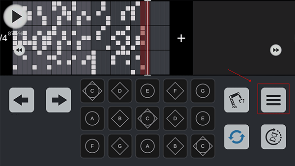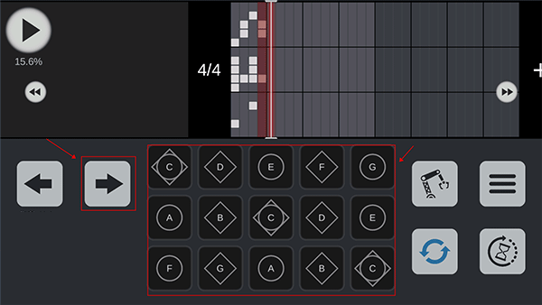 3、接着在下面键盘中安处你的琴键,按完后点击右箭头进入下一行编辑