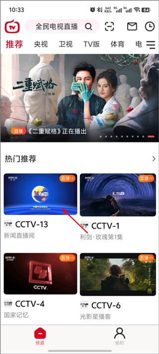 用户进入频道页面就可以开始看电视直播啦,可以在屏幕上方的分类里选择推荐、央视、卫视、电视剧等视频分类进行观看。