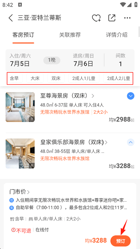 2、可以在上方筛选适合的房间类型,确认无误后点击预定;