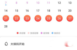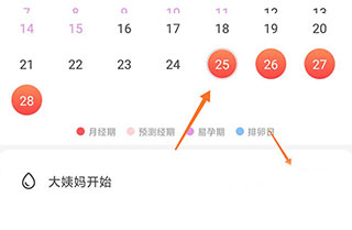 2、然后选择正确的时间来开启大姨妈开始按钮,然后系统就会根据用户之前设置的经期天数来显示正确的日期;同时根据设置的周期长度来预测下一次的经期。