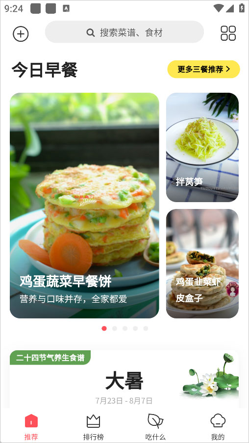 美食杰网独特的三餐菜谱推荐,每天推荐15道精品菜谱,覆盖三餐及下午茶、夜宵。