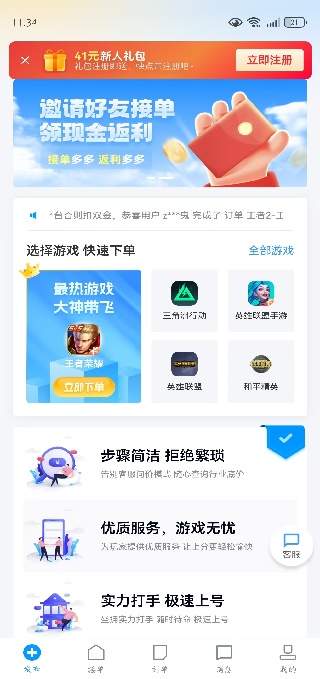 2、接单赚钱:海量代练订单来自各大热门游戏,任君选择,轻松赚钱;