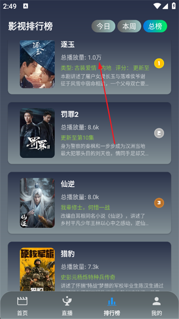 3、然后我们也可以通过上方的“排行榜”功能来获取到今日、本周、总榜等多个榜单。