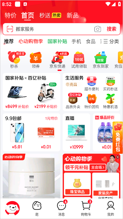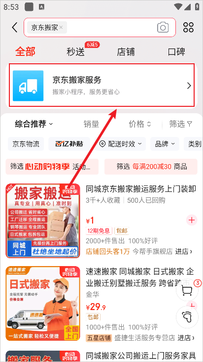 1、京东搬家是京东App内的一个功能,所以咱们在上方搜索框直接搜索【京东搬家】