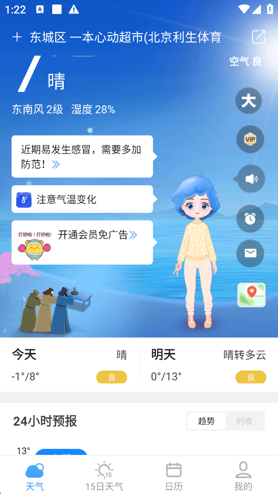 天气预报早预知,轻松查阅24小时内天气变化,提早预防早晚温差过大。