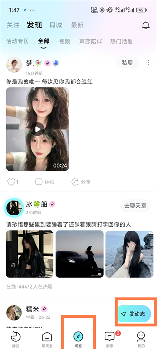 1、打开软件,点击【动态】这里会有发动态的功能