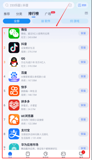 2、排行榜单展示当前热门的各类软件,用户可参考下载量及评分进行选择。