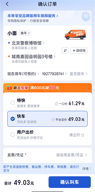 2、完成后平台会帮你计算价格,确认叫车完成支付后等待司机接单即可。