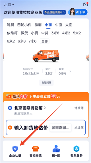 1、登录认证后在下单界面选择车型和装货地点及目的地。