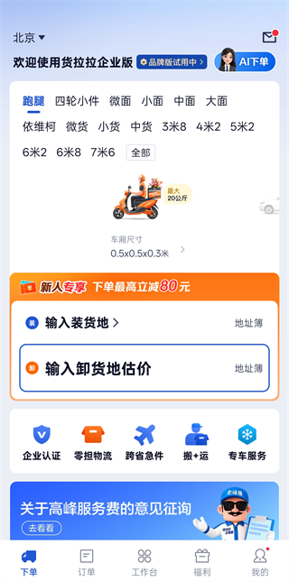 货拉拉企业版是专为百万企业打造的智慧货运管理平台,覆盖同城即时用车、跨城急件及定制城配全场景,整合全国363城超120万月活司机资源,支持24+车型一键调度,提供API对接、月结账期等企业专属服务,从下单、运输到开票、报销全流程线上化,透明计价降本30%,让企业货运管理更高效、更安全、更省心。