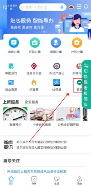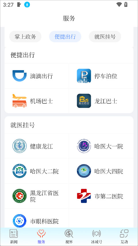 2、服务界面中提供掌上政务、便捷出行、就医挂号等生活生产服务