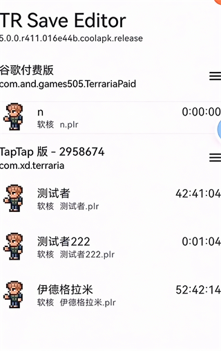 自动扫描设备上可编辑的.plr(角色)/.wld(世界)存档文件,直接显示在列表中。
