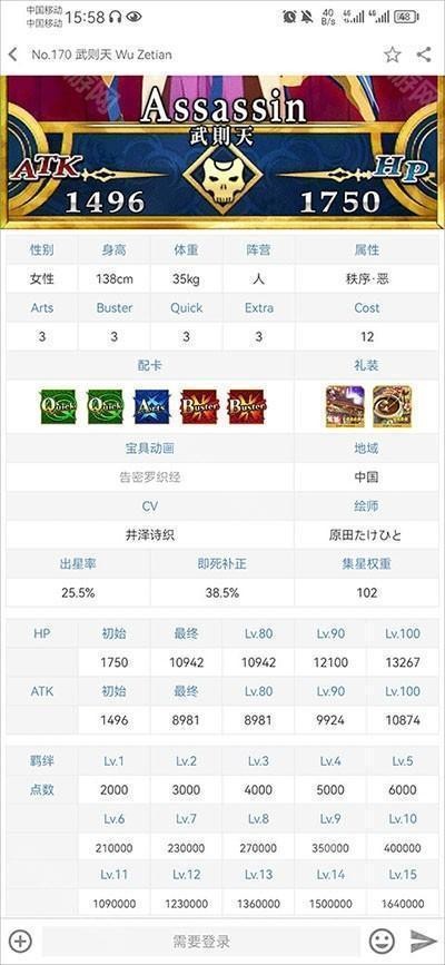 3、查找到指定角色图鉴后,点击进入可以查看到该角色的属性、配卡、礼装、宝具等各种详细信息。