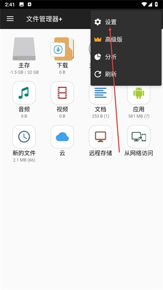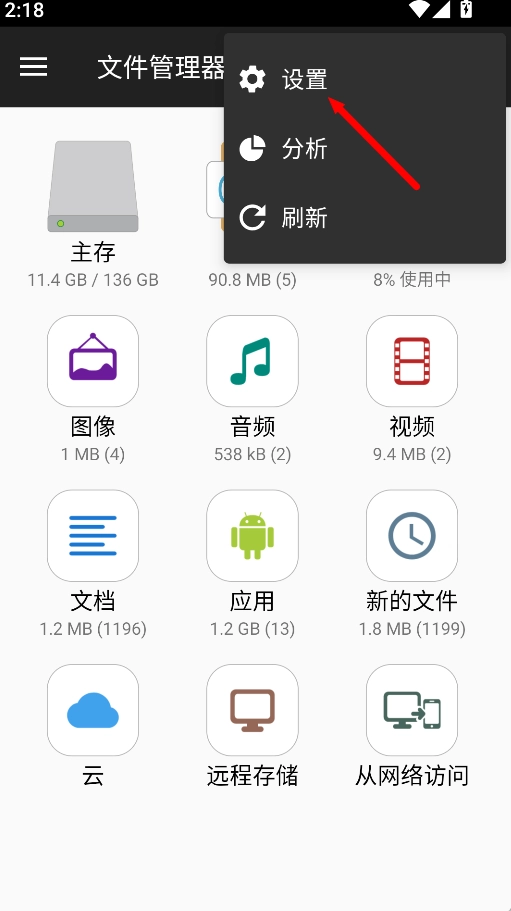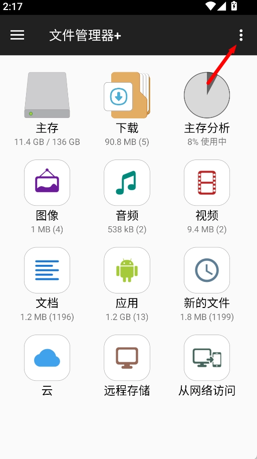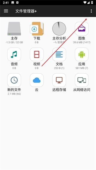 打开FM文件管理器应用的首页后,点击页面右上角的三点图标,即可进入到更多功能选项的界面。