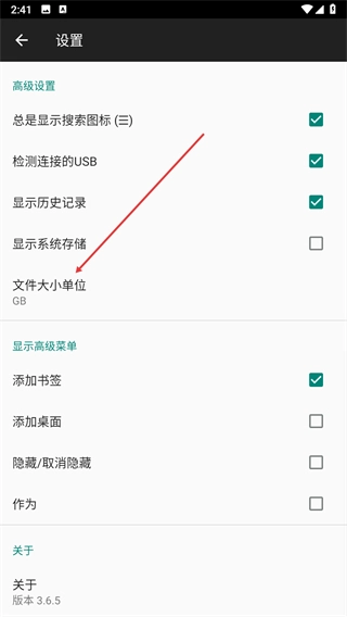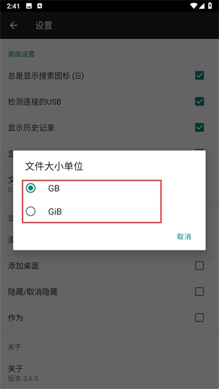 找到文件大小单位的相关选项,点击后打开单位选择的弹窗界面。