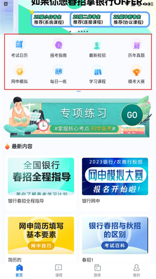 1、在首页可以了解到各大银行的最新校招活动还有历年真题练习等等。