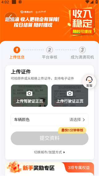 2、进入上传信息环节,按提示上传驾驶证、行驶证并选择车辆颜色,提交资料等待平台审核,审核通过后即可成为滴滴快车司机。