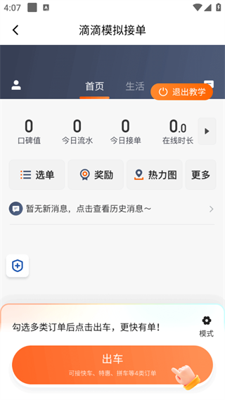 1、打开滴滴车主App,勾选订单类型后点击下方的出车按钮,开启接单状态。