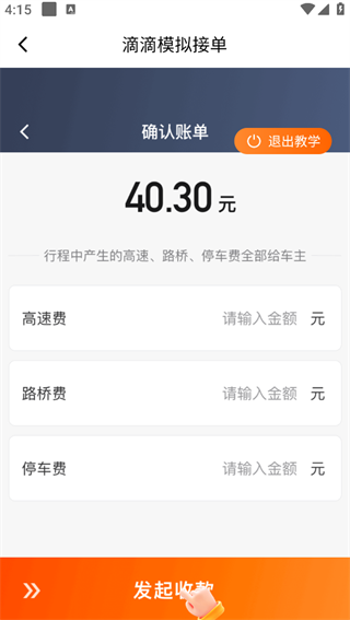 6、行程结束进入确认账单环节,如有高速费、路桥费可与乘客沟通价格进行输入,核对账单金额及各类费用后,点击发起收款即可。