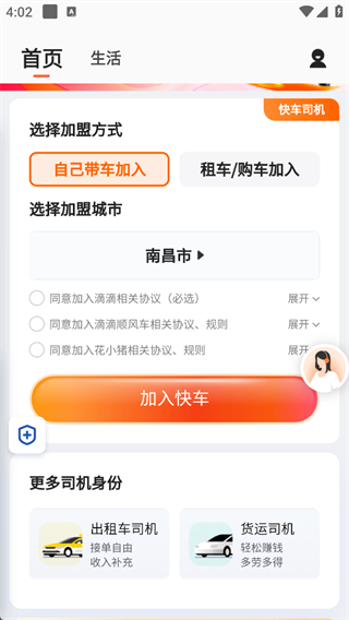 1、打开滴滴车主App,在首页可以看到有三种方式注册【出租车、货运、快车】选择 “自己带车加入” 的加盟方式与加盟城市,勾选相关协议后点击 “加入快车”,进入下一步注册流程。