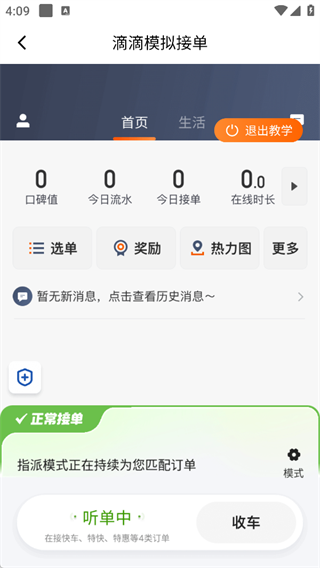 2、随后会切换至听单中模式,平台自动匹配订单,等待系统派单。