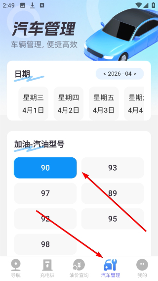 4、点击底部汽车管理图标,进入页面后可选择汽油型号管理车辆相关的加油信息。