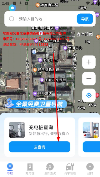 1、进入导航首页在充电桩查询板块点击去查询,可快速进入充电桩查询页面。