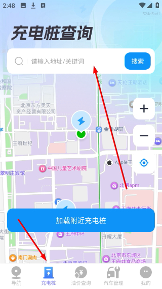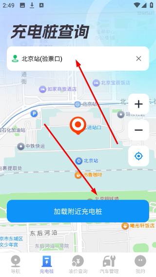 3、输入目的地如北京站验票口后点击加载附近充电桩,即可查看该位置周边的充电设施。