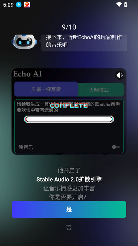 1、打开登录EchoAI一键成曲app后进行简单的ai问答流程后即可启动它进行ai音乐创作,创作时只需要用户输入简单的文字描述即可创作