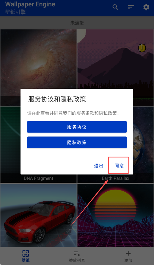 1、打开壁纸引擎应用程序进入主操作界面,点击同意服务条款进入应用功能页面开始使用。