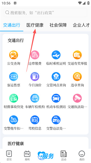 2、在服务页面中浏览各类服务分类 然后选择医疗健康选项进入;