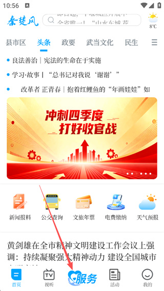 1、打开软件后进入首页 在功能列表中找到并点击服务入口进入相关页面;