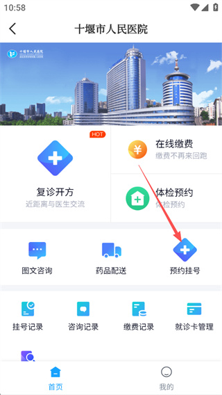 4、进入医院页面后点击预约挂号功能,按照提示选择科室和时间即可完成预约流程。