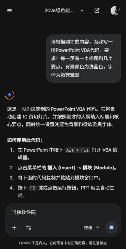 1、你可以让Gemini写一段VBA代码,直接在PowerPoint中运行生成幻灯片。