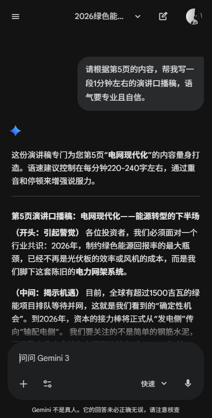 演讲稿:“请根据第5页的内容,帮我写一段1分钟左右的演讲口播稿,语气要专业且自信。”