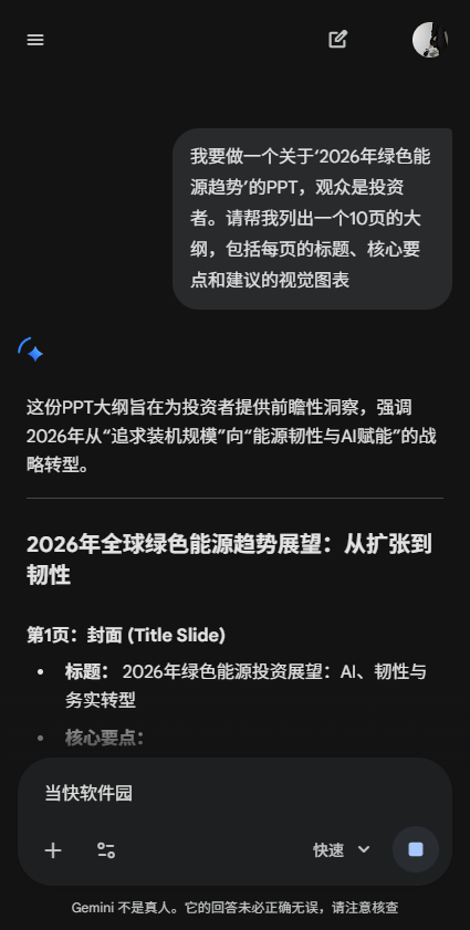 Gemini会提供:逻辑严密的结构、每一页的具体文案,以及哪里该放图片或数据的建议,这里大家可根据自己的实际需求修改。