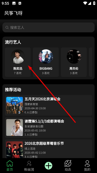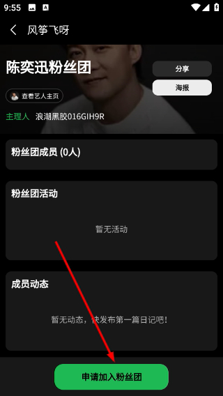 4、进入陈奕迅粉丝团页面,点击申请加入粉丝团参与相关活动与动态。
