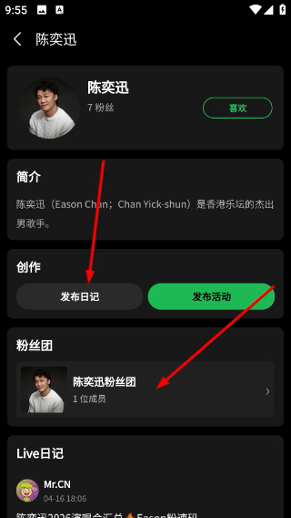 2、进入艺人详情页可查看简介信息,点击发布日记或活动按钮创建。