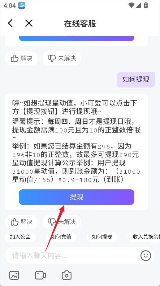 温馨提示:每周四、周日才是提现日哦,提现金额需满100元且为10的正整数倍哦。